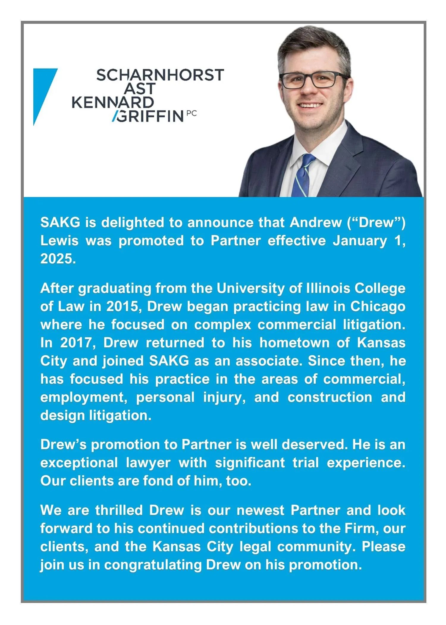 We are pleased to announce that Andrew (“Drew”) Lewis was promoted to partner on January 1, 2025. Congratulations, Drew!
